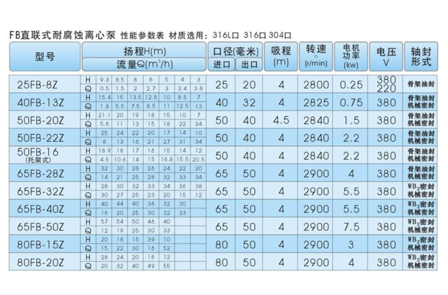 FB型耐腐蝕泵具有性能穩定可靠,密封性能好,外觀美觀,使用檢修方便,泵體、泵蓋、葉輪、軸套等主要零部件均采用不銹鋼材料制造。FB型采用機械密封裝置,根據需要選用單端面或者雙端面機械密封,密封腔內通入有一定壓力的水沖洗摩擦端面起冷卻作用,介質溫度在-20℃ ~ 130℃范圍之間,流量:2-400m3/h;,揚程:10-105m。